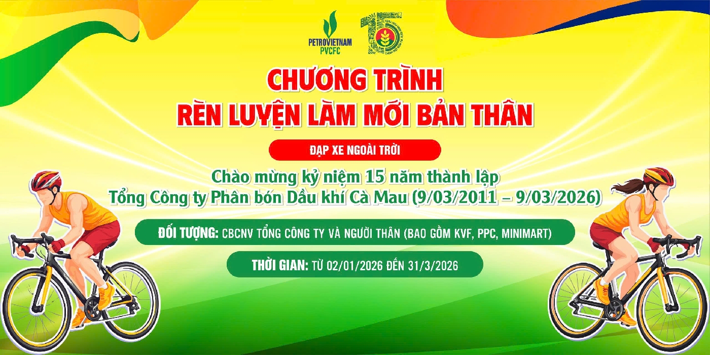 ĐẠP XE - LÀM MỚI BẢN THÂN CHÀO MỪNG KỶ NIỆM 15 NĂM NGÀY THÀNH LẬPTỔNG CÔNG TY PHÂN BÓN DẦU KHÍ CÀ MAU (09/03/2011 – 09/03/2026) - THÁNG 3 01/03/2026 - 31/03/2026